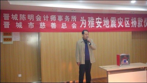 2013年4月28日下午三時(shí),陳明集團(tuán)會議室里愛意濃濃,正在舉行為雅安地震捐款獻(xiàn)愛心活動,此次捐款活動我們有幸請到了晉城市慈善總會陳副會長光臨并作了重要講話,表示一定將陳明集團(tuán)全體員工的愛心送到雅安同胞手上。